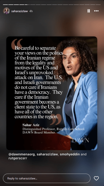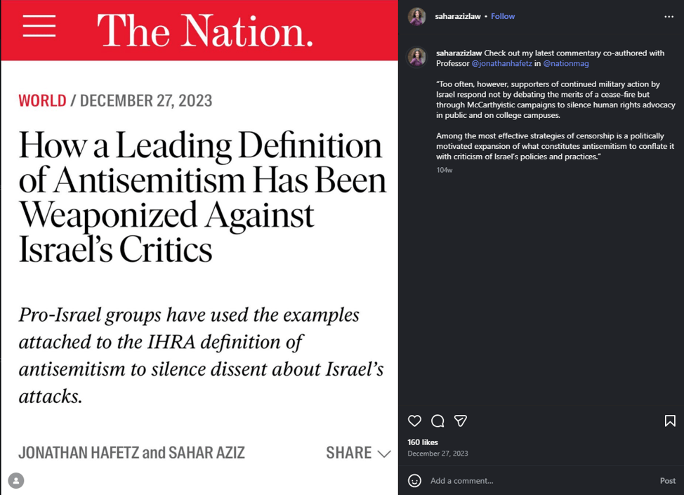 MisinformationSahar Aziz appeared in an event with Raz Segal, in which she claimed that the IHRA definition of antisemitism is a “threat to free speech and Palestinian civil rights