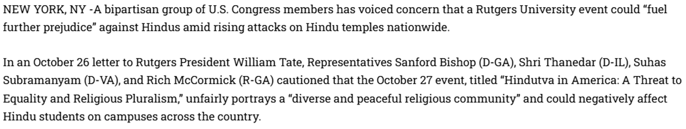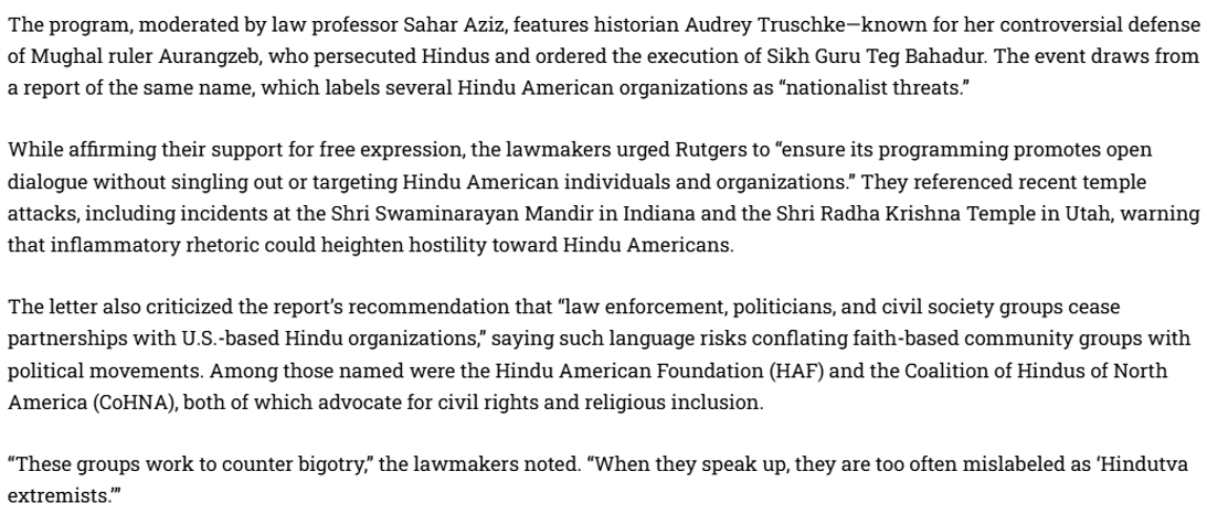 Community hatredRutgers’ “Hindutva” event held moderated by Sahar Aziz raised concerns with bipartisan US congress members, alleging it could “fuel further prejudice” against Hindus
