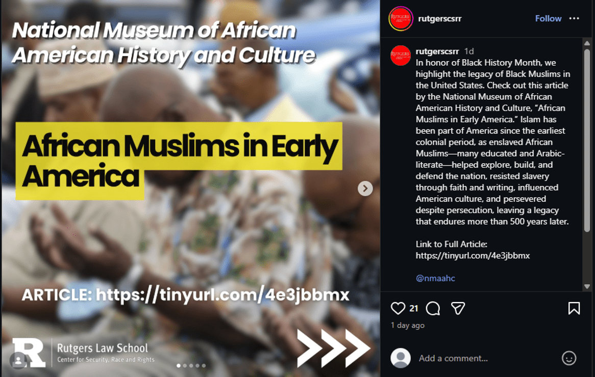 CSRR and Sahar Aziz posted about “African Muslims in Early America”, trying to hijack black history month and make it about Muslims.